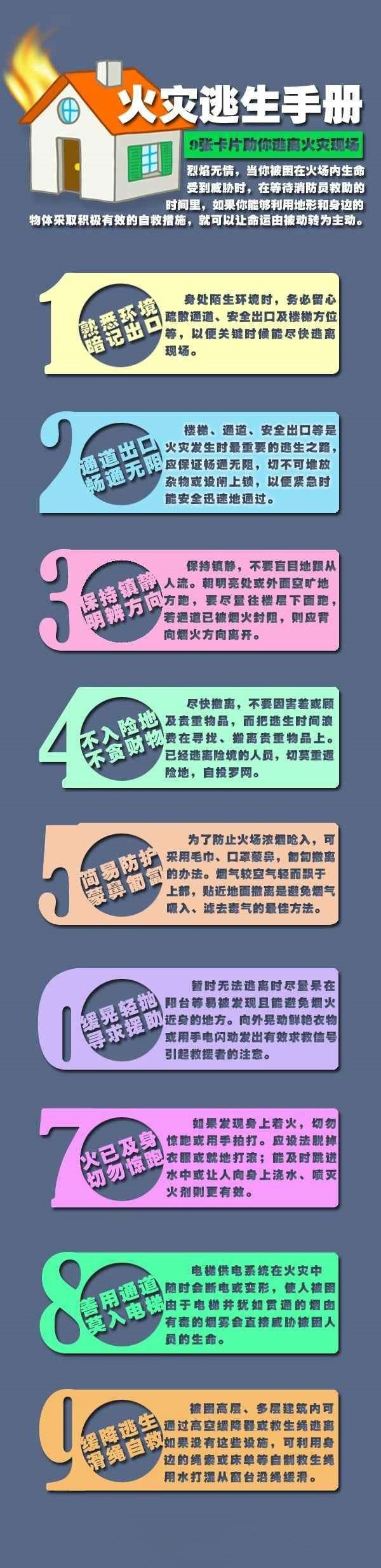 烈焰无情,当你被困在火场内生命受到威胁时,在等待消防员救助的时间里,如果你能够利用地形和身边的物体,采取积极有效的自救措施,就可以让命运由被动转为主动,9张卡片助你逃离火灾现场。