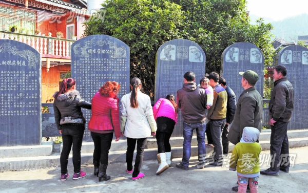 华寨村村民聚集在“合约自治”碑前阅读。 谭元勇摄